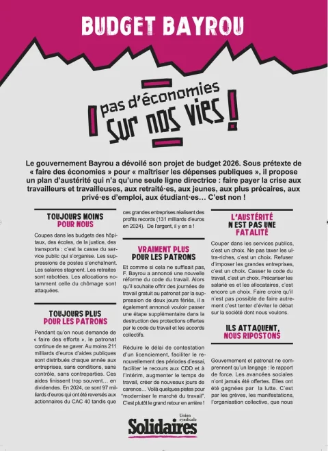Face à l’austérité, nous portons l’exigence d’un autre budget, au service d’une société plus juste, plus solidaire et plus écologique. Solidaires fera campagne pour lutter pied à pied pour un budget qui améliore la vie de toutes et tous.