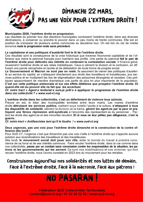 - DIMANCHE 22 MARS, PAS UNE VOIX POUR L’EXTREME DROITE ! : le dimanche 22 mars 2026 de 19:45 à 20:45
