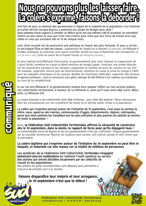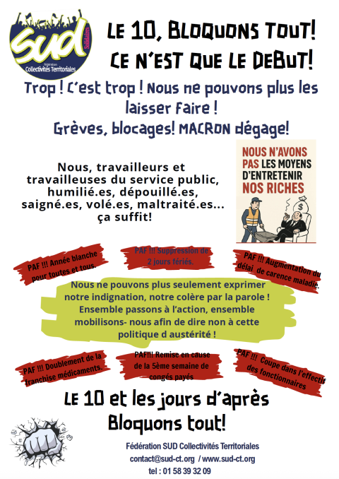 L’Union syndicale Solidaires, et notre fédération nationale SUDCT, appellent à se mettre en grève et à soutenir le mouvement « bloquons tout » qui exprime la colère sociale multiforme et grandissante face aux annonces budgétaires du gouvernement Bayrou.