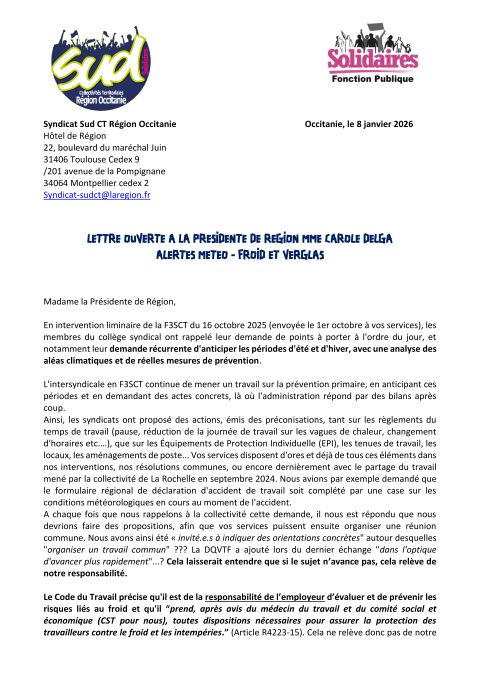 LETTRE OUVERTE SUD A CAROLE DELGA - météo, froid et verglas - 08012026