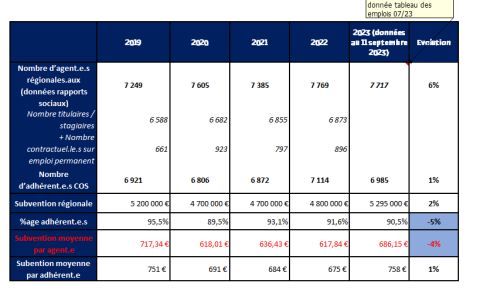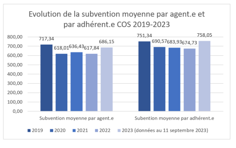 Nous ne pouvons que constater la baisse constante de la subvention allouée par la collectivité, même si elle a été plus élevée cette année. En effet, il faut regarder sa progression depuis 2019 et étudier la subvention théorique moyenne par agent.e potentiellement éligible au COS, et non le montant global annuel.