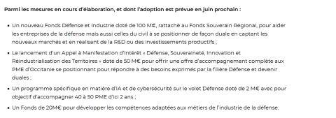 Mais comme si la surmobilisation du gouvernement ne suffisait pas, la Région (qui n’a plus de sous on le redit !) annonce 200 millions d’euros pour financer les industriels de la guerre communément appelés les marchands d’armes.