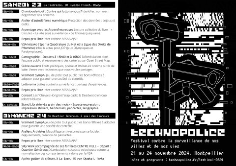 - Festival Technopolice à Montpellier et Sète du 21 au 24 novembre 2024 : (…) : du jeudi 21 novembre 2024 au dimanche 24 novembre 2024