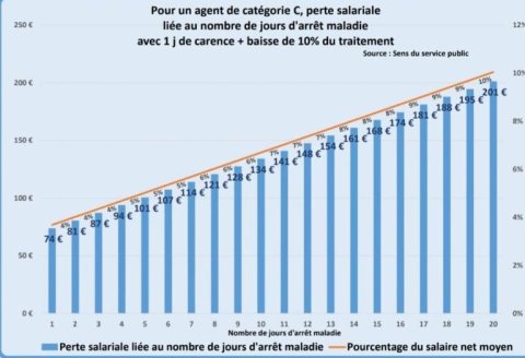 - 201€ avec 20 jours d’arrêt (=10% du salaire moyen d’un agent de catégorie C).
