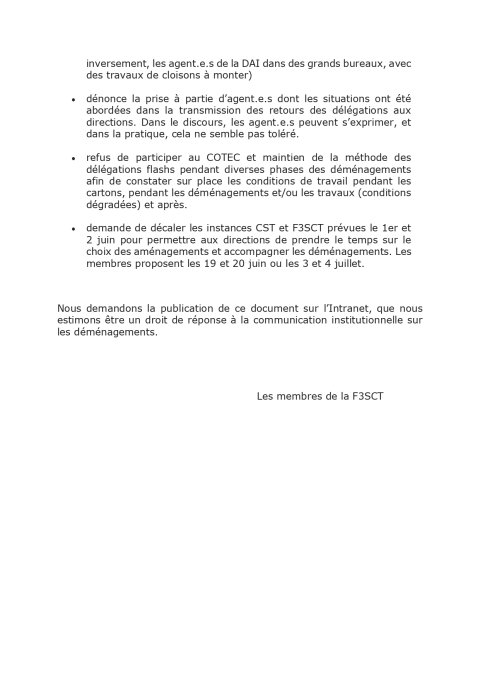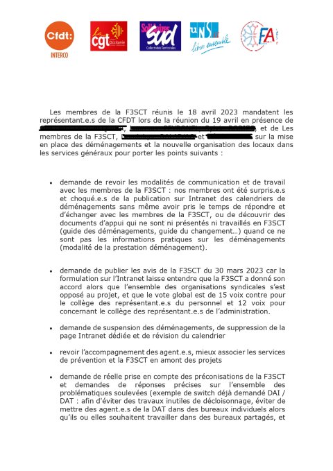 Aussi, les membres de la F3SCT réunis en réunion de travail ont mandaté deux collègues de la CFDT, membres de la F3SCT, pour porter nos demandes collectives concernant les déménagements mais aussi la qualité du "dialogue social".
