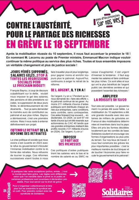 Tout cela est possible. Le gouvernement n’a jamais été aussi faible. La mobilisation du 10 septembre a été une grande réussite avec des centaines de milliers de grévistes en France et des mobilisations déterminées et inventives dans tout le pays. Elles ont pris les formes décidées localement par les comités de base. Solidaires soutient et encourage ces formes d’organisations au plus près du terrain. Sur nos lieux de travail, il nous faut construire les grèves les plus importantes possibles : c’est la meilleure manière de tout bloquer et de toucher l’économie pour faire reculer le gouvernement et le patronat !