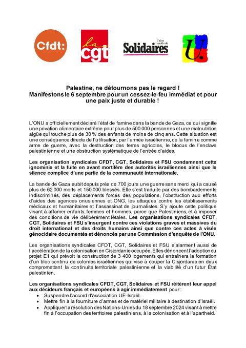 Communiqué de press intersyndical CFDT Solidaires CGT FSU : "Palestine, ne détournons pas le regard !