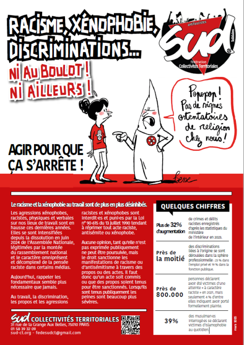 SUDCT Région Occitanie refuse de laisser le racisme et la xénophobie se répandre dans nos bureaux, nos ateliers, nos cuisines, nos salles de pause. Nous lutterons contre cela, et nous ne lâcherons rien !