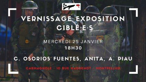 Le collectif SAM a organisé le 02 juillet dernier, le colloque "Armes policières mutilantes Analyses et combats". Il a été l’occasion de montrer une première fois le travail du photographe chilien Carlos Osorio Fuentes et de l’artiviste Anita. Nous vous proposons de les retrouver accompagnés du travail d’Aurélie Piau et d’affiches mises à disposition par le média Contre Attaque dans cette nouvelle exposition intitulée Ciblé·e·s.
